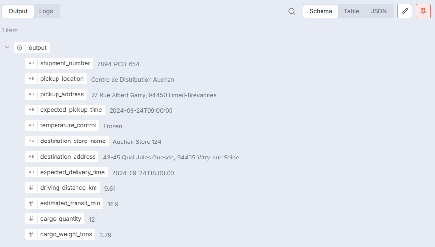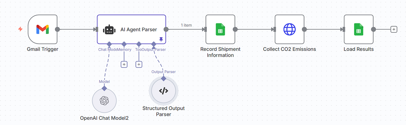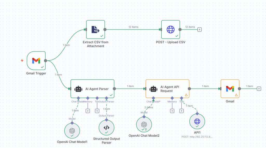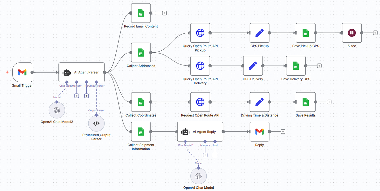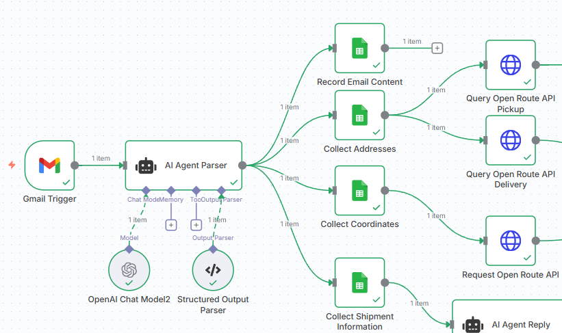 - AI Agent Node parses the email into strict JSON (addresses, times, distance, weight, etc.).