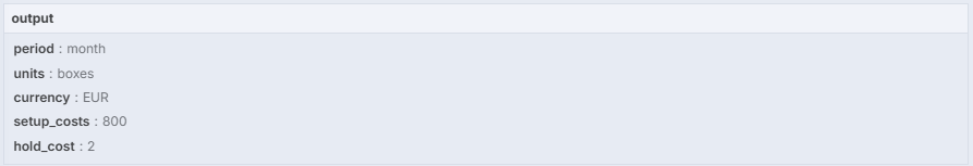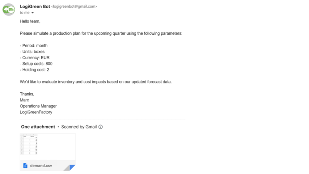 - Email body: production planning parameters like holding costs, setup costs, and unit of measure