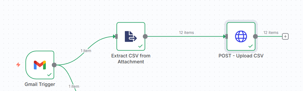 The GMAIL trigger node collects the email body and downloads the attachment.