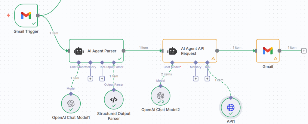 In this AI workflow, we utilise only the AI Agent Parser, which collects the parameters from the email.