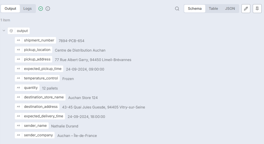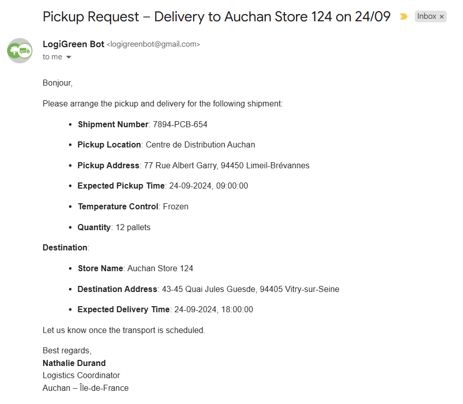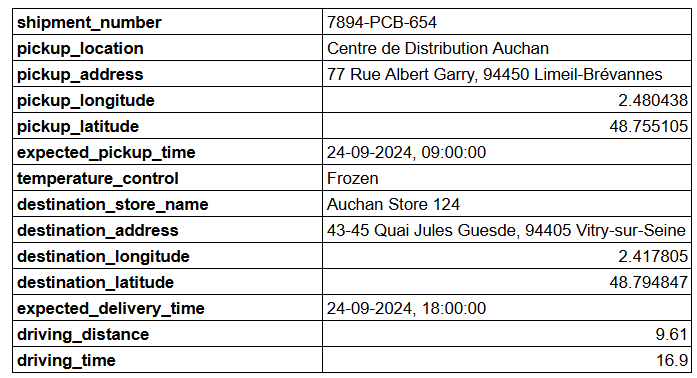 - AI Agent Parser is parsing the email to extract the shipment information (pickup location, delivery location, pickup time …)