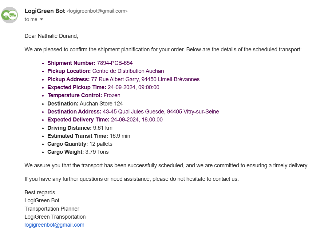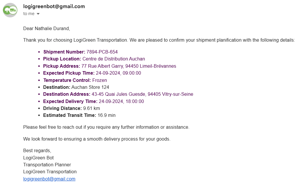 - AI Agent Reply that uses the shipment parameters along with the distance and time to send shipment confirmation