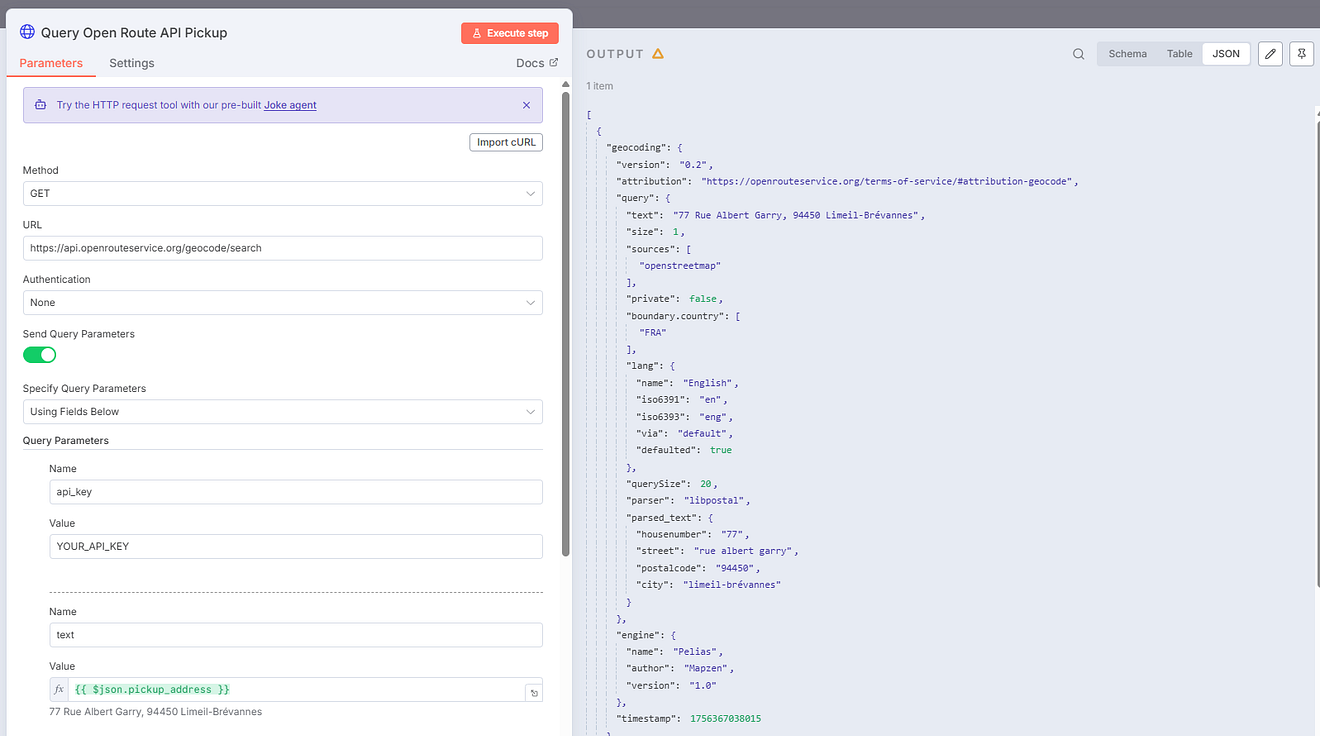 We are then using the HTTP nodes to query the Open Route Service API to collect the GPS coordinates of the pickup and delivery locations.