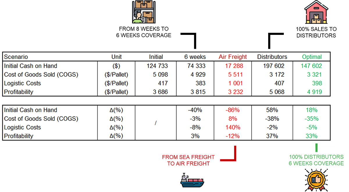 The insights from the model helped my friend reduce the cash needed to run the business and reduce the Cost of Goods Sold (COGS).