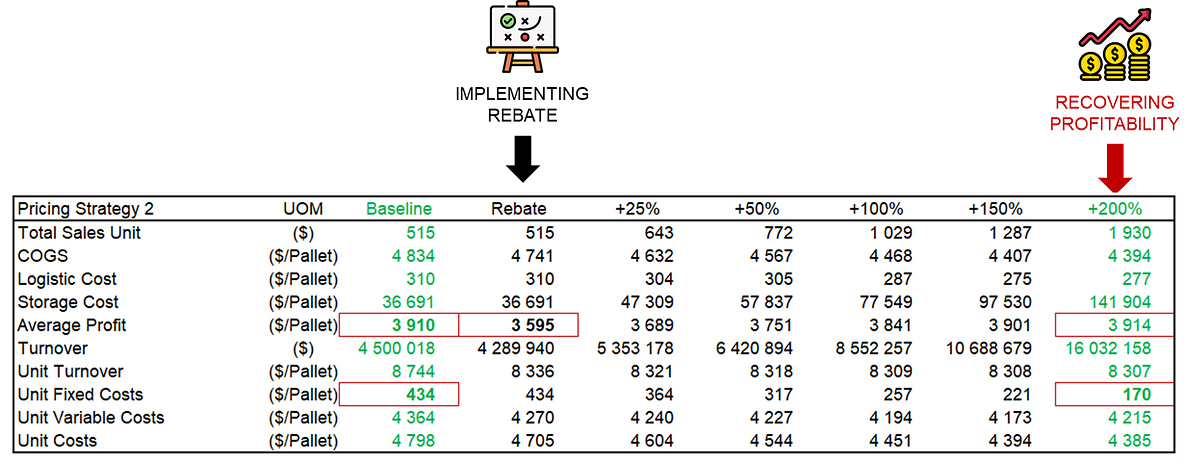 In the table above, we simulate the impact of pricing strategy two, assuming seven turnover scenarios.