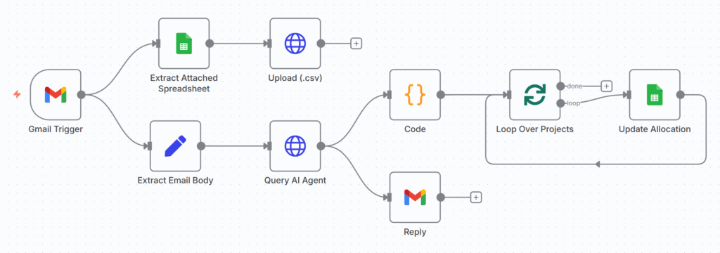 - Step 1: Using the n8n Gmail node, we send the email body and the spreadsheet attached to the FastAPI Backend