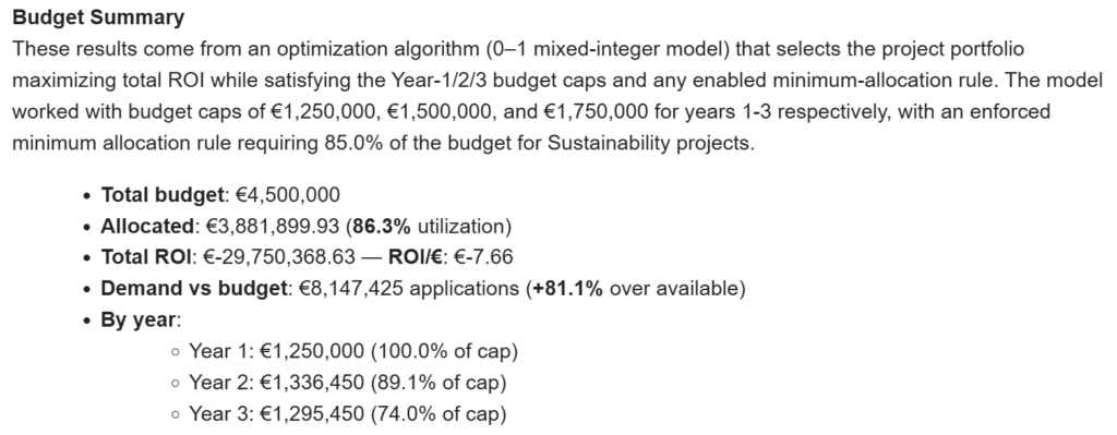 We will then review the architecture and explore the results using a real request for budget optimisation with a constraint of a minimum 20% allocation for sustainability projects.