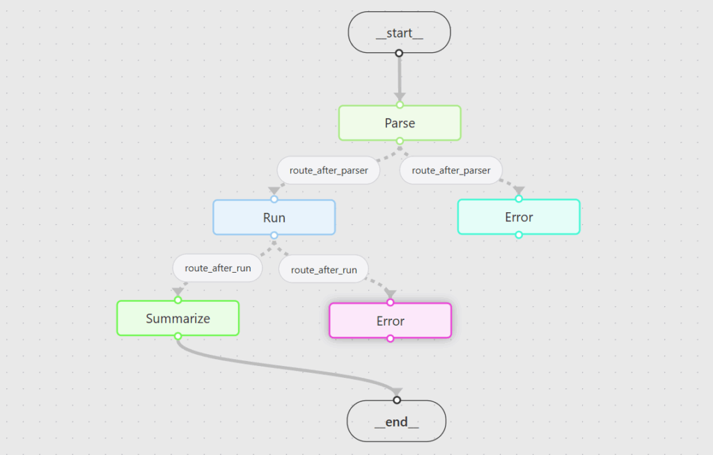 route_after_parsewill direct the flow based on the output of the email parsing: iferrorin state → go to"error"; else →"run".route_after_runwill direct the flow based on the output of the FastAPI Microservice calling: iferrorin state → go to"error"; else →"summarize".