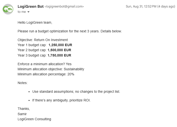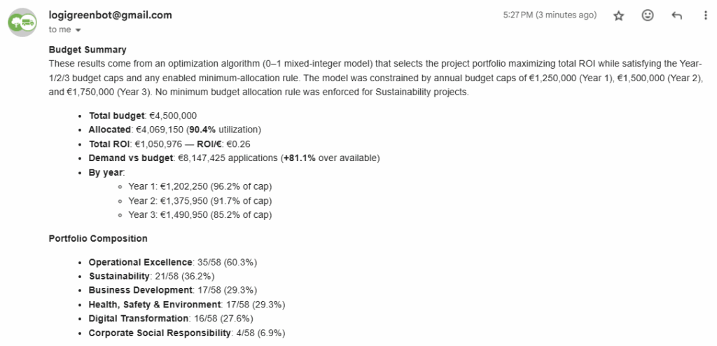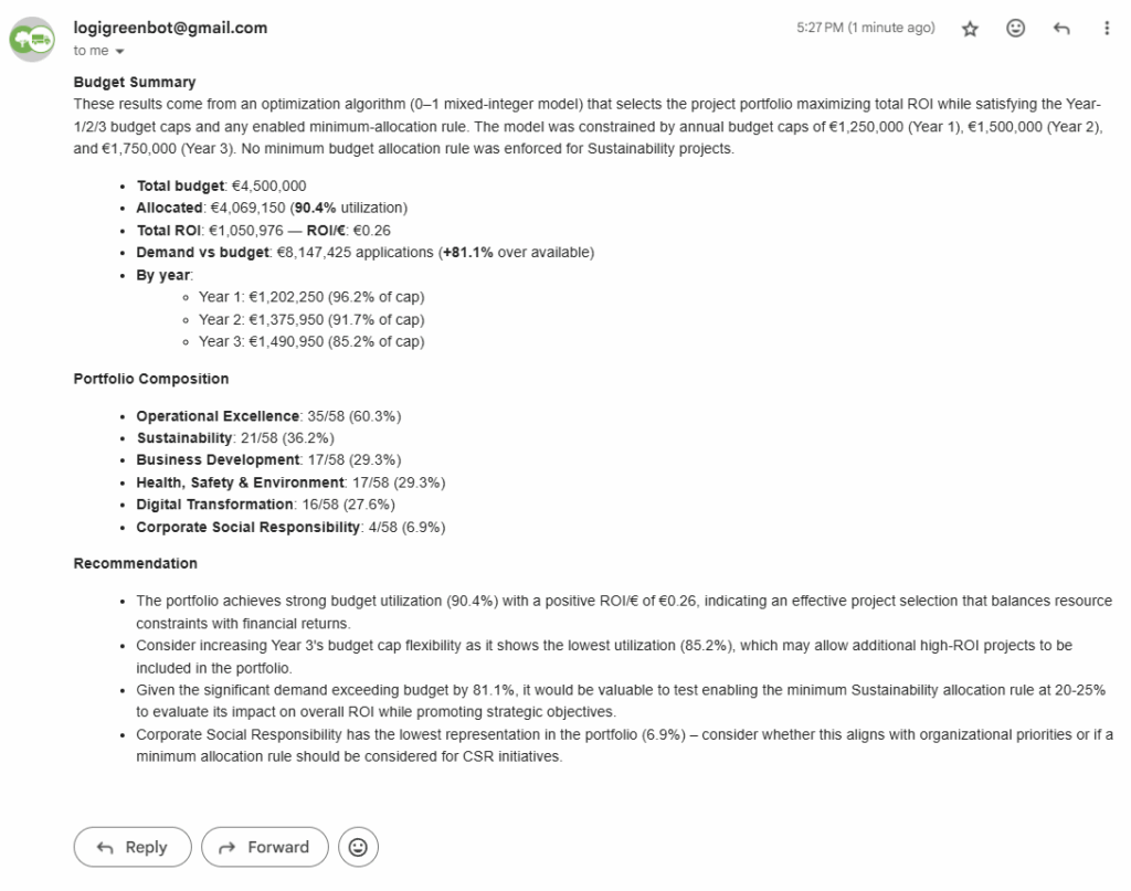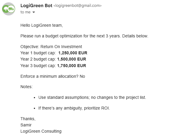 Based on this email, the workflow should automatically select projects for optimal budget allocation.