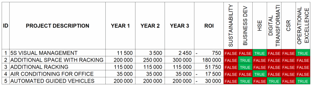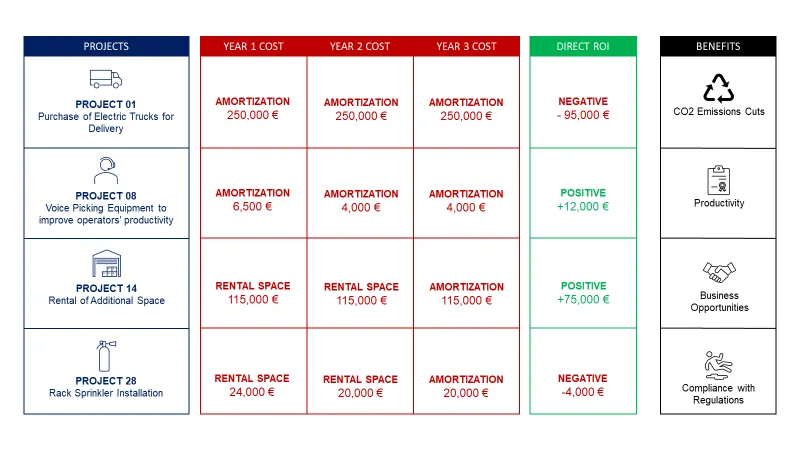 A warehouse automation project can reduce the usage of packaging material (sustainability), decrease operator fatigue (CSR), and accelerate digital transformation.