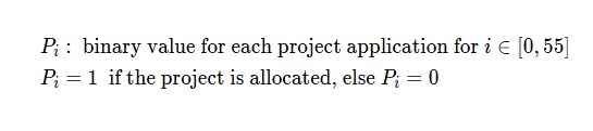 For each project i, we define a binary value to inform if we allocate a budget or not: