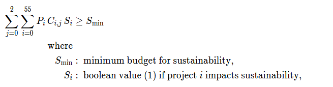 In the example above, we ensure that the total investment for sustainability projects is equal to or greater than S_min.