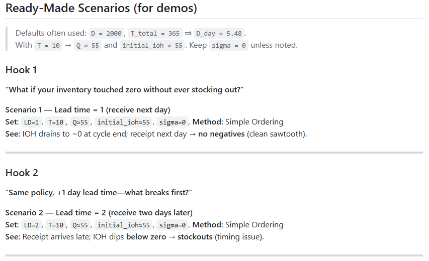 sigma: float = Field(0, ge=0, description="Standard deviation of daily demand (units/day)")These operational parameters cover