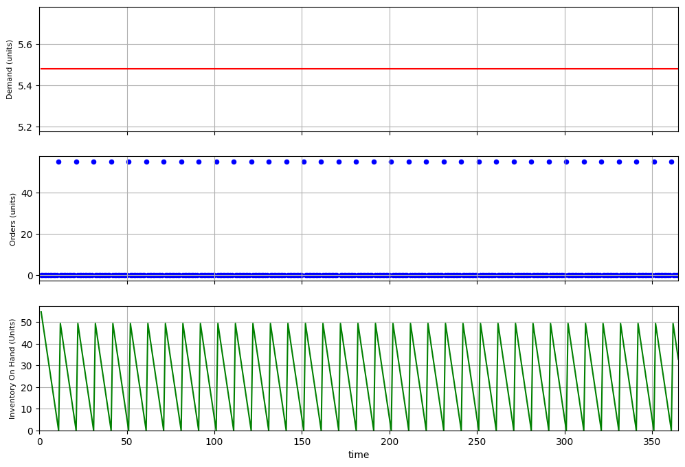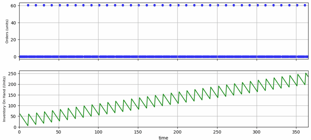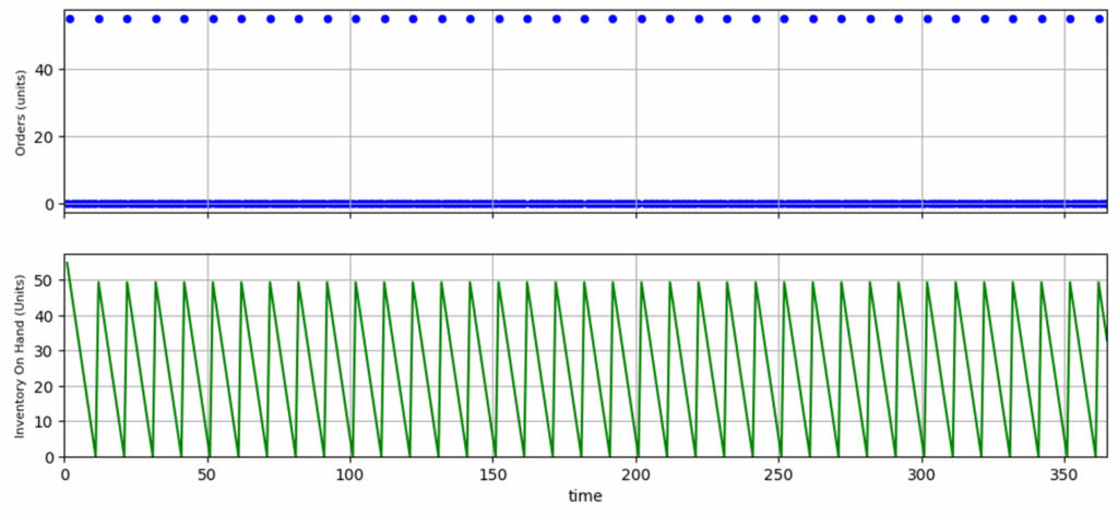 order()which represents a periodic ordering policy (you order Q units every T days)simulation_1()that calculates the impact of the demand (sales) and the ordering policy on the inventory on hand each day