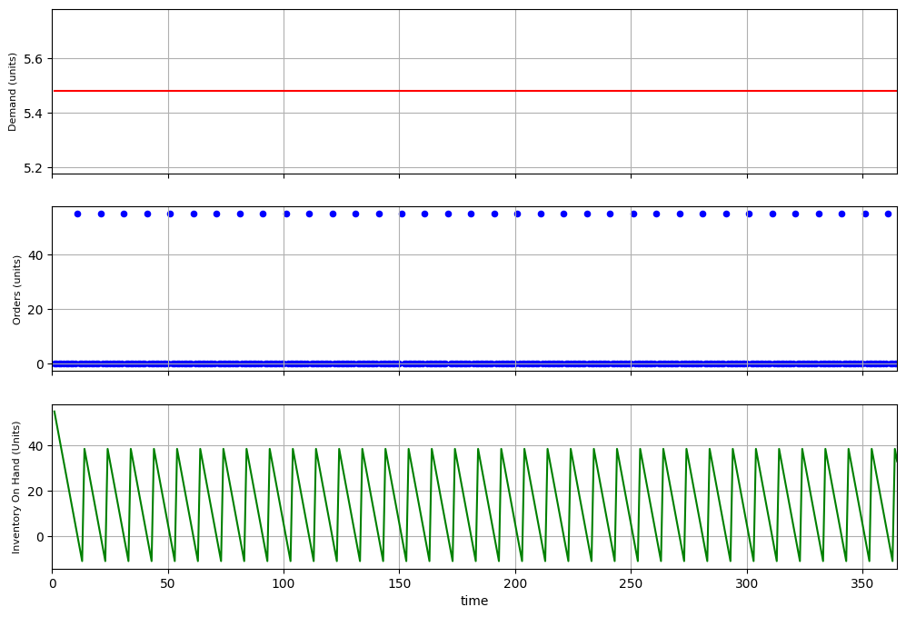 As you can see in the green chart, your inventory on-hand (IOH) is always positive (i.e. you don't experience stock-outs).