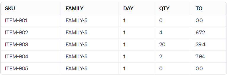 SKU: This column represents the Stock Keeping Unit, a unique identifier for each item (SKU 1234: Evian Mineral Water 1.5L Bottle)FAMILY: This column indicates the family or category to which the item belongs. (FAMILY-23: Beverages)DAY: This column should include the day number, representing a time frame for the analysis.QTY: This is the quantity sold or moved for the SKU on that specific day.TO: This stands for Turnover, reflecting the total sales value of the SKU on that day.