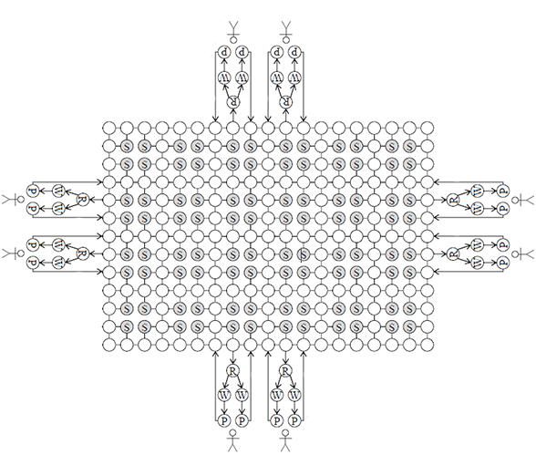 - W represent the waiting points where your AGV with a shelf waits for the completion of the picking activity of the AGV that arrived at the picking station before