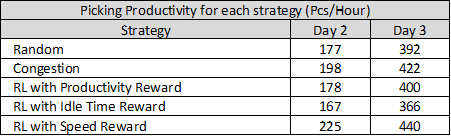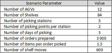 - Productivity: the number of items picked per labour-hour during the period from the AGV starting at an origin point to it arriving at a destination.