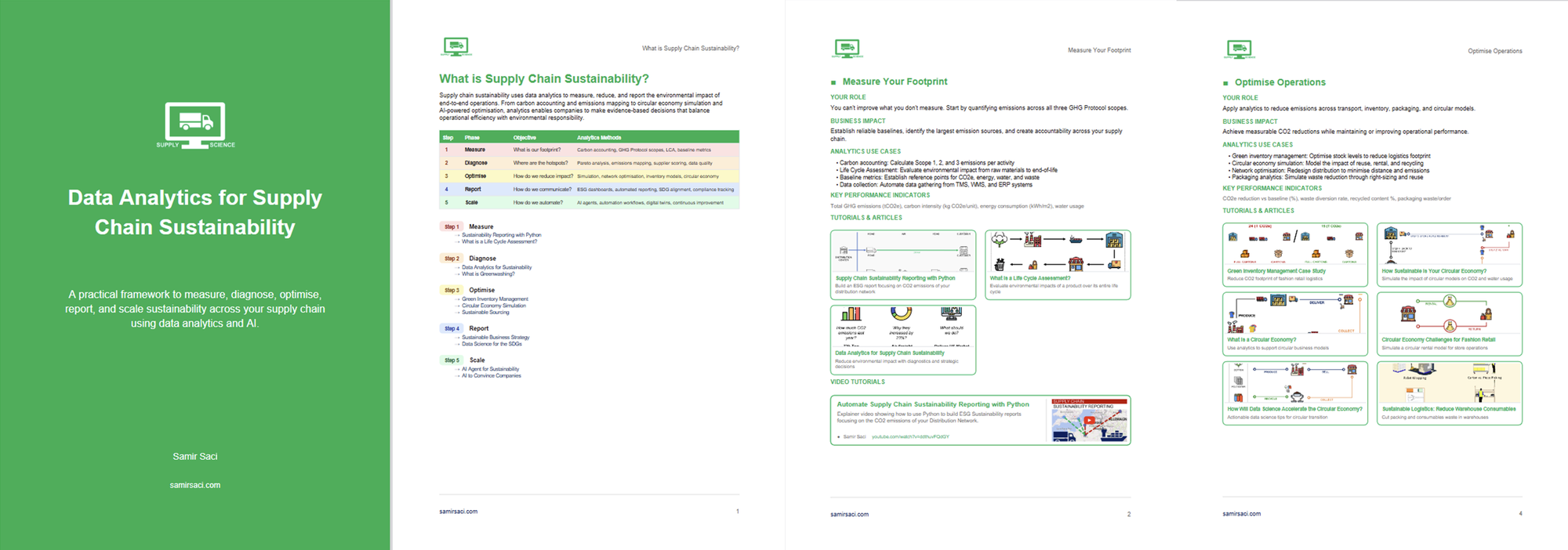 A 5-step framework to measure, diagnose, optimise, report, and scale sustainability across your supply chain. Covers carbon accounting, circular economy simulation, ESG reporting, and AI-powered optimisation with hands-on tutorials and video walkthroughs.