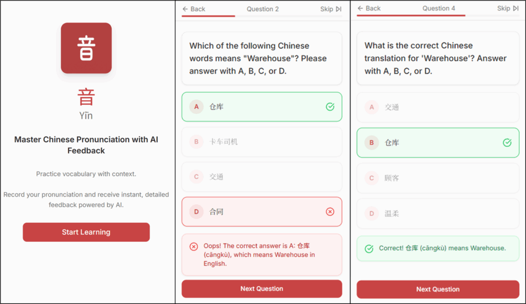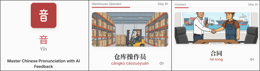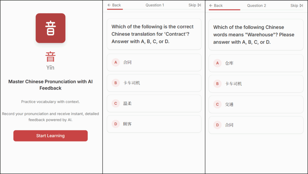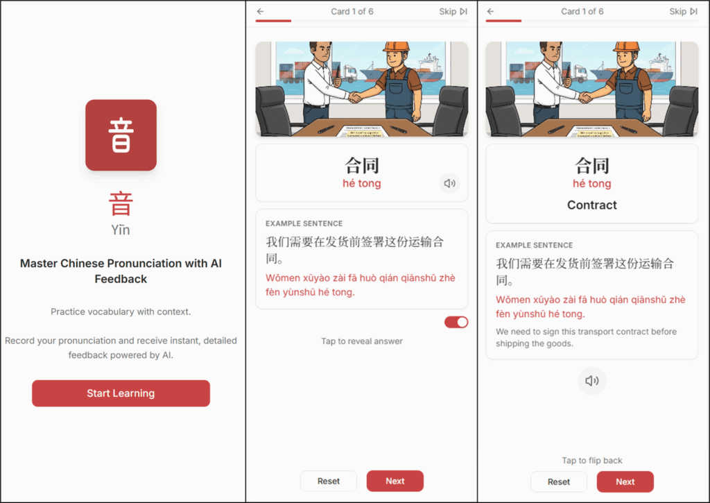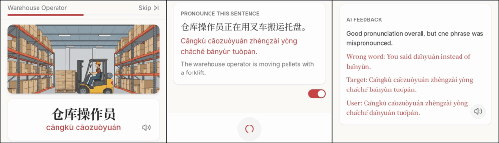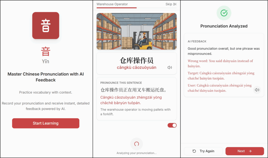 Using speech-to-text and reasoning, the app listens to what I say, compares it with the target sentence, and gives feedback on which tones or syllables were off.