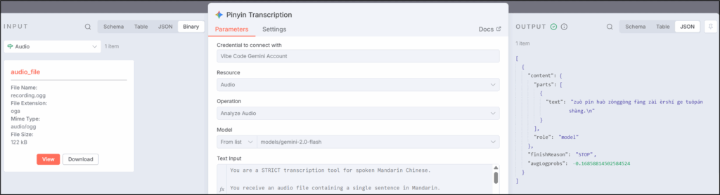 The output of this Gemini audio transcription node includes the phonetics: