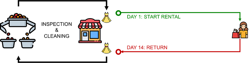 Therefore, we would like (ideally) to reach 100% of rental transactions with reused items and limit the number of new items purchased.