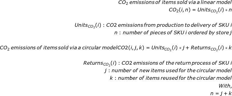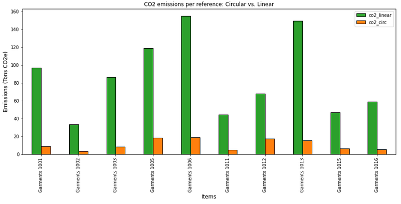 - We can compare, for each item, the CO2 emissions if all items were used once (linear) with the circular model applied to this example.