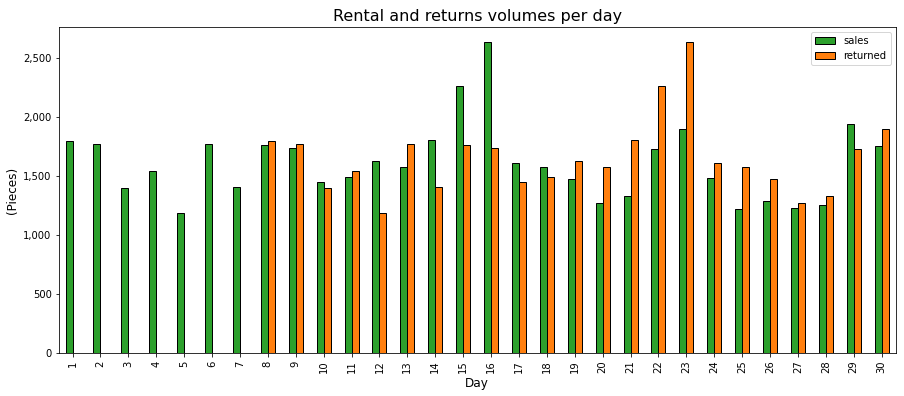 Indeed, we can see that the first batch of rented items are returned on day 8.