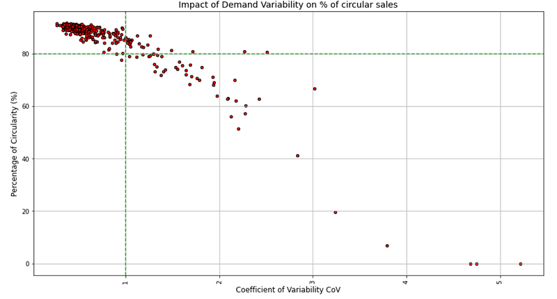 - 99.9% of items with CV<1 have a percentage of circular sales higher than 80%