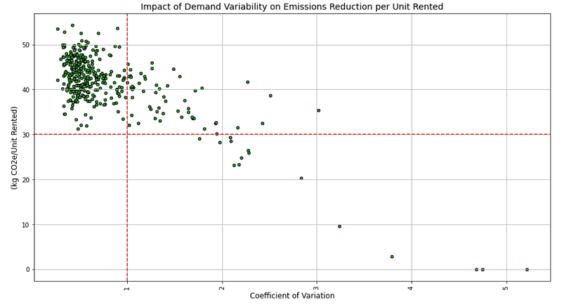- 100% of items with CV<1 have a reduction higher than 30 kg CO2e per Unit Rented.