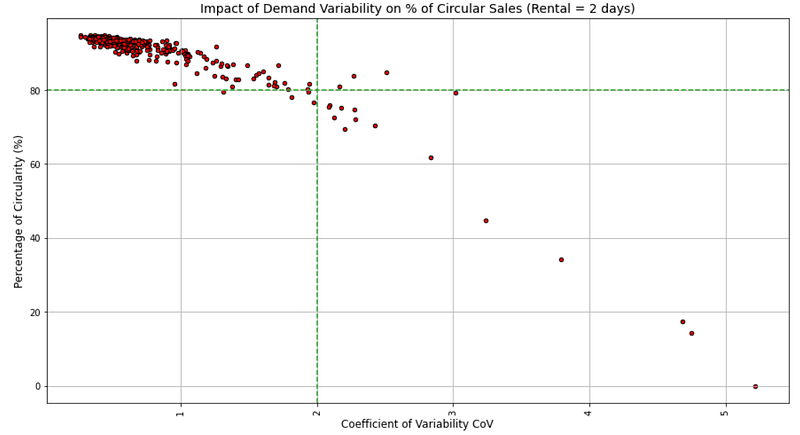 - 99% of items with CV < 2 have more than 80% of their rental transactions fulfilled with reused items (versus CV<1 for rental period = 7 days)