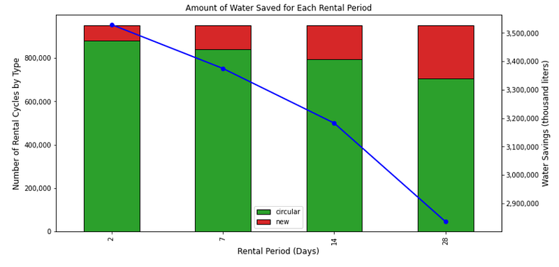 We can start to explore the results with a rental period of one week and see the impacts on CO2 emissions and water usage.
