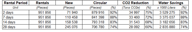 Even in the worst-case scenario, a rental period of 28 days, we can reach a 60% of CO2 reduction and -74% of water usage.