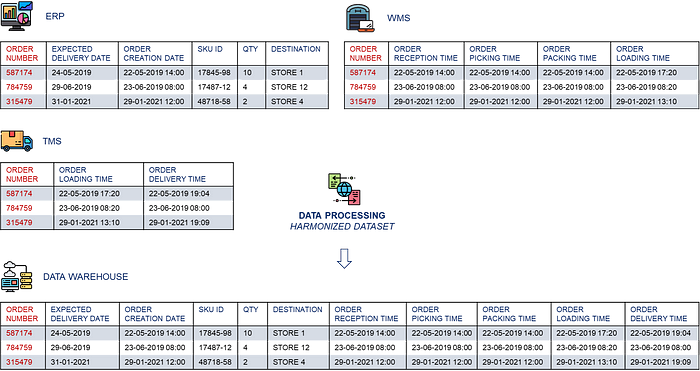 The final result can be a self-service database of harmonised tables containing transactional records covering the full cycle from raw material collection to store delivery.