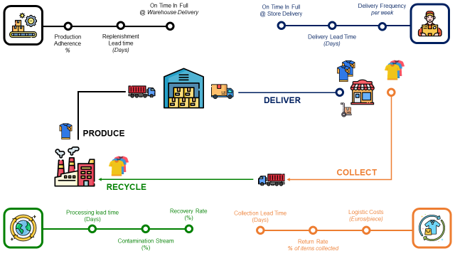 Logistic Costs (Euros/piece), Ratio of Returned Items (%) and Collection Lead Time (Days) - Identifying potential improvements for the recycling process with Recovery Rate (%), Contamination Stream (%) and Processing Lead Time (Days)