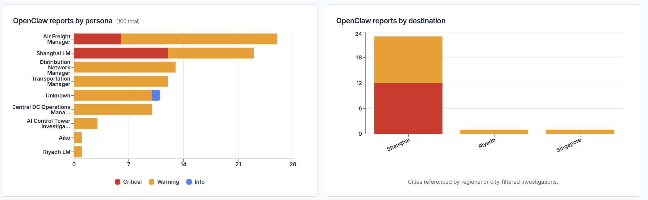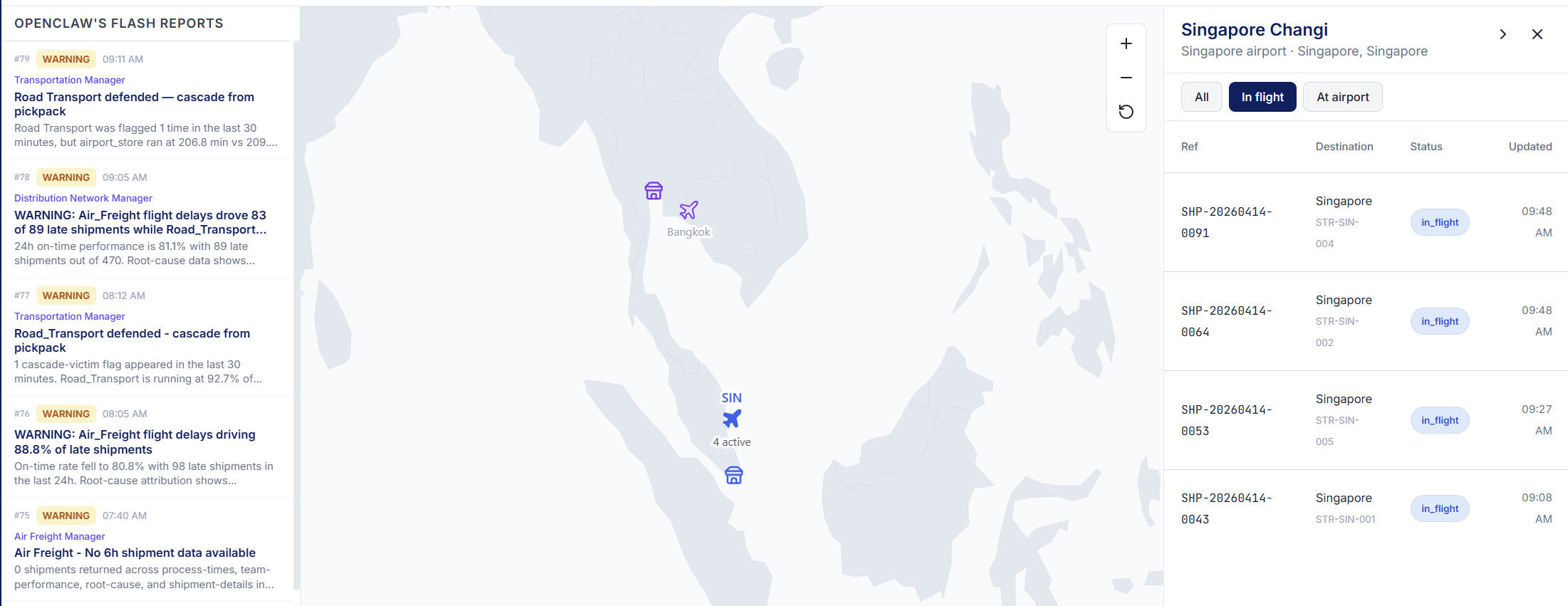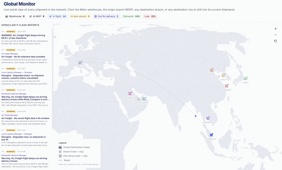 The simulation is running right now with live shipments flowing through Milan to Asia and the Middle East, and OpenClaw's personas are posting flash reports every 4 hours.