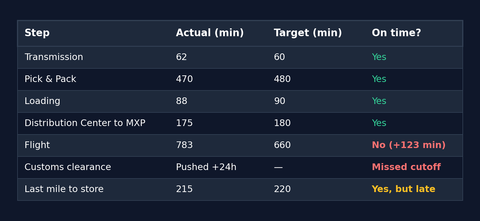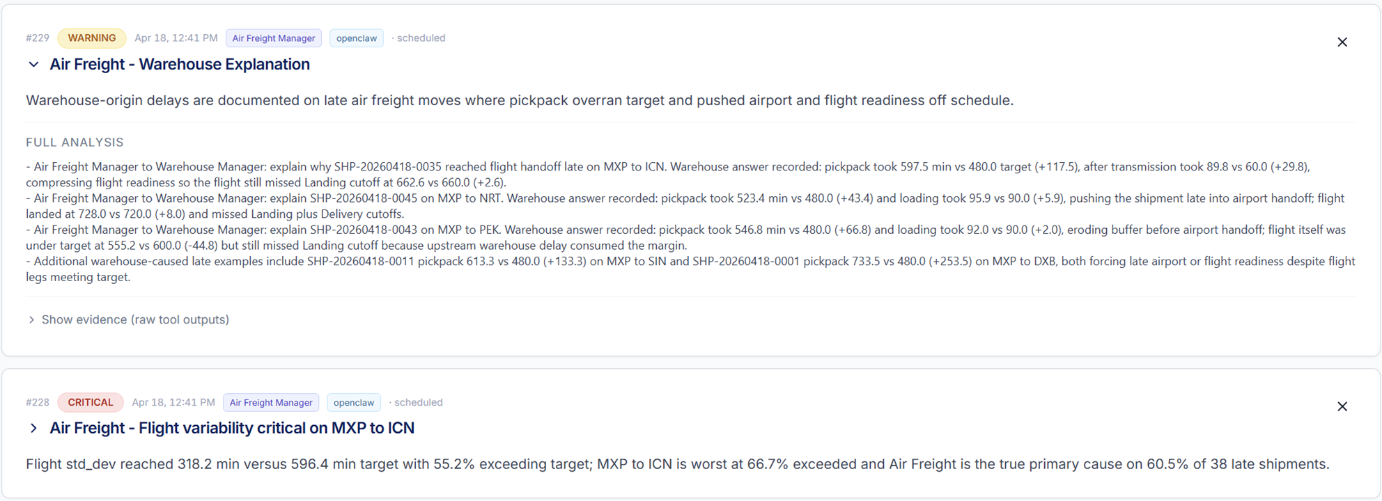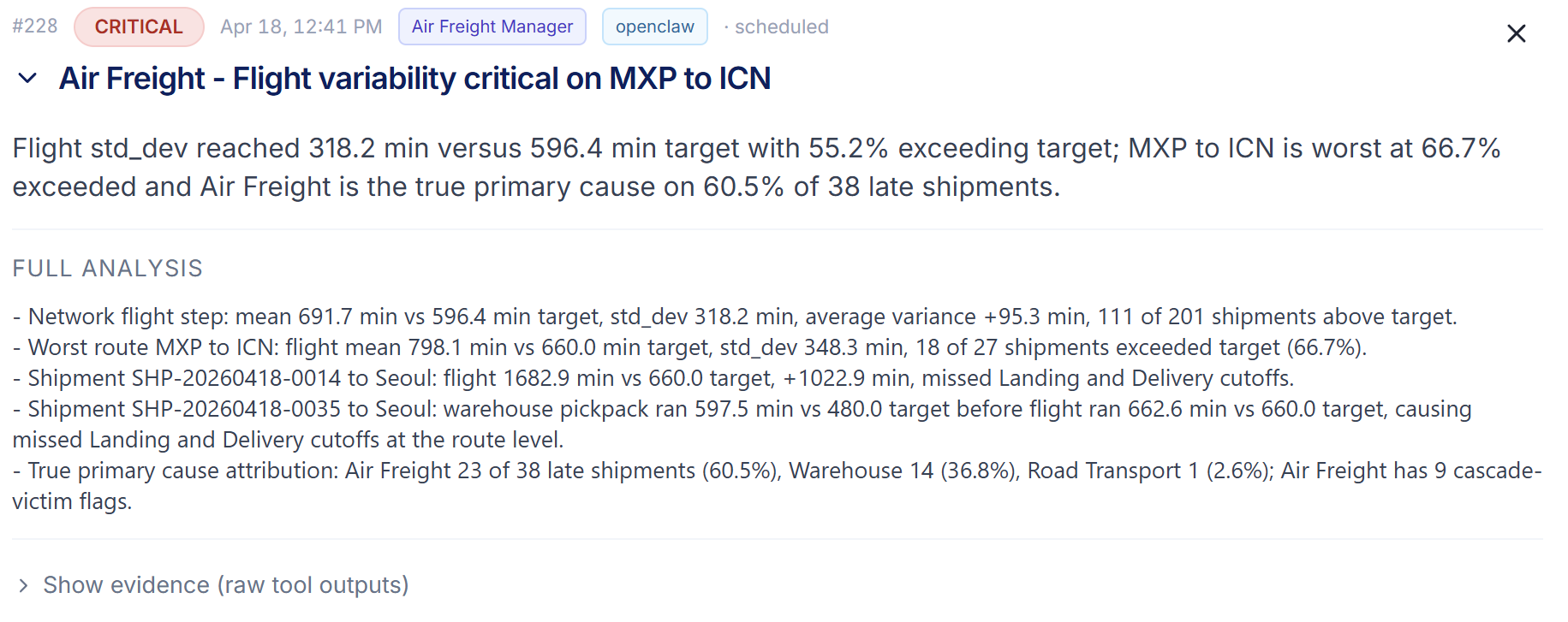 - The summary, a single sentence with the finding (e.g. Pick & pack delays pushed several shipments past the flight readiness deadline)