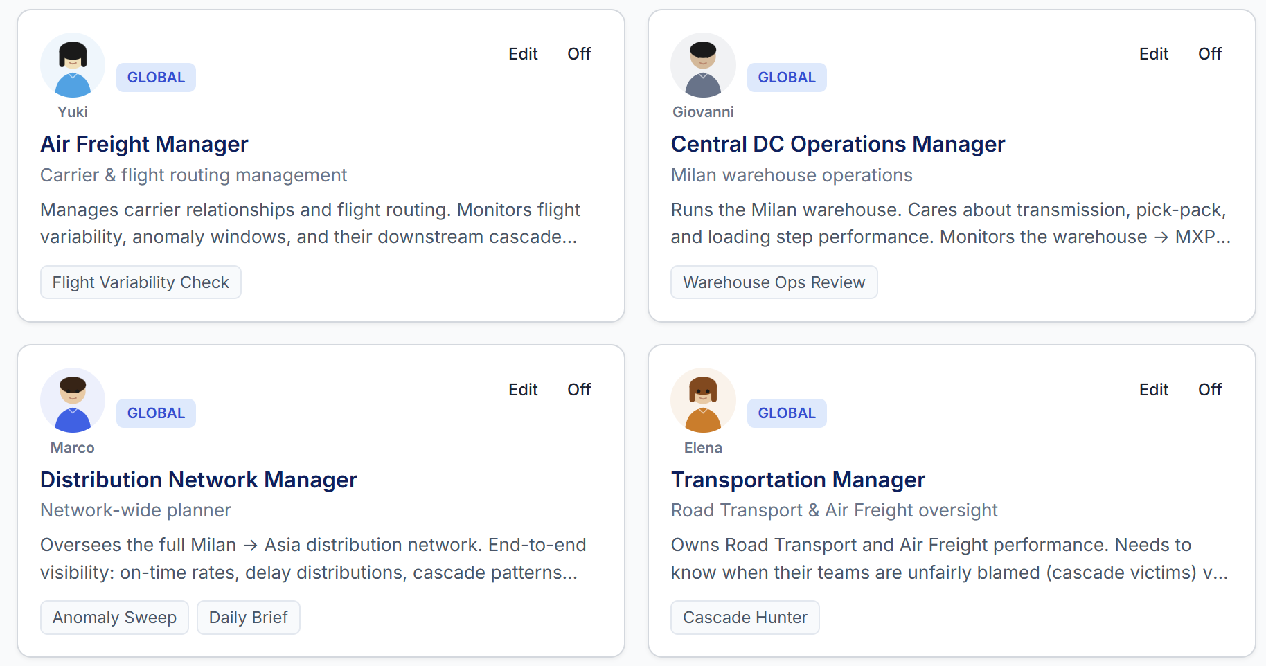 - Marco, the Distribution Network Manager, runs the overall anomaly sweep and flags any city that is drifting.