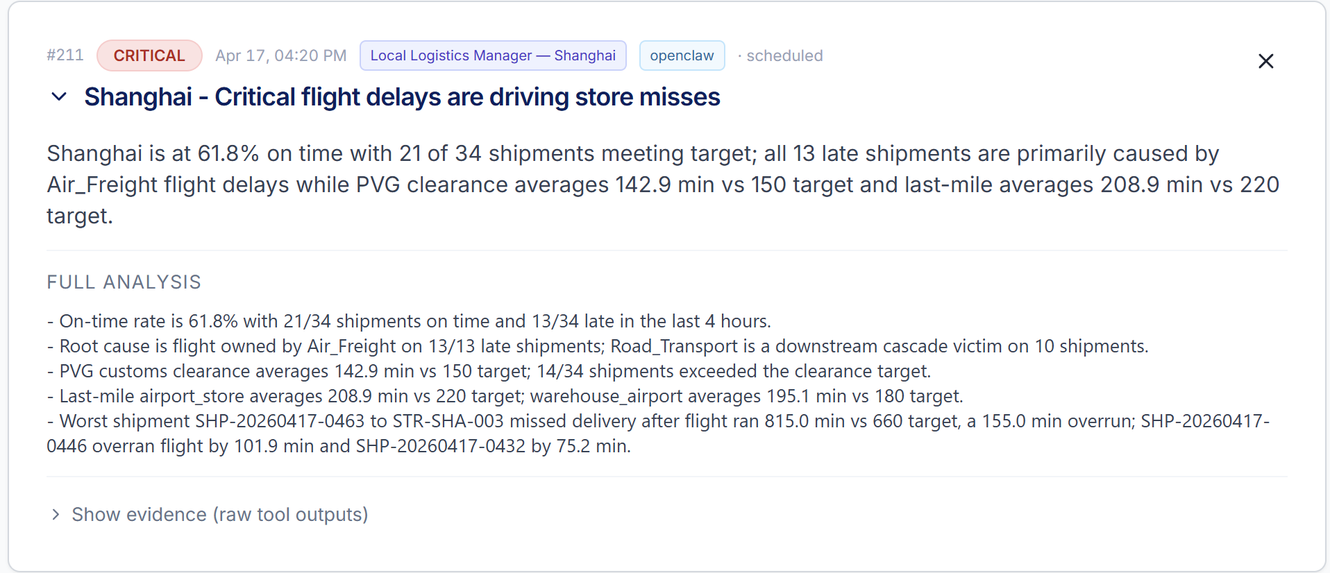 This agent was able to investigate, by connecting to the shipment data, and find the root cause of specific failures.