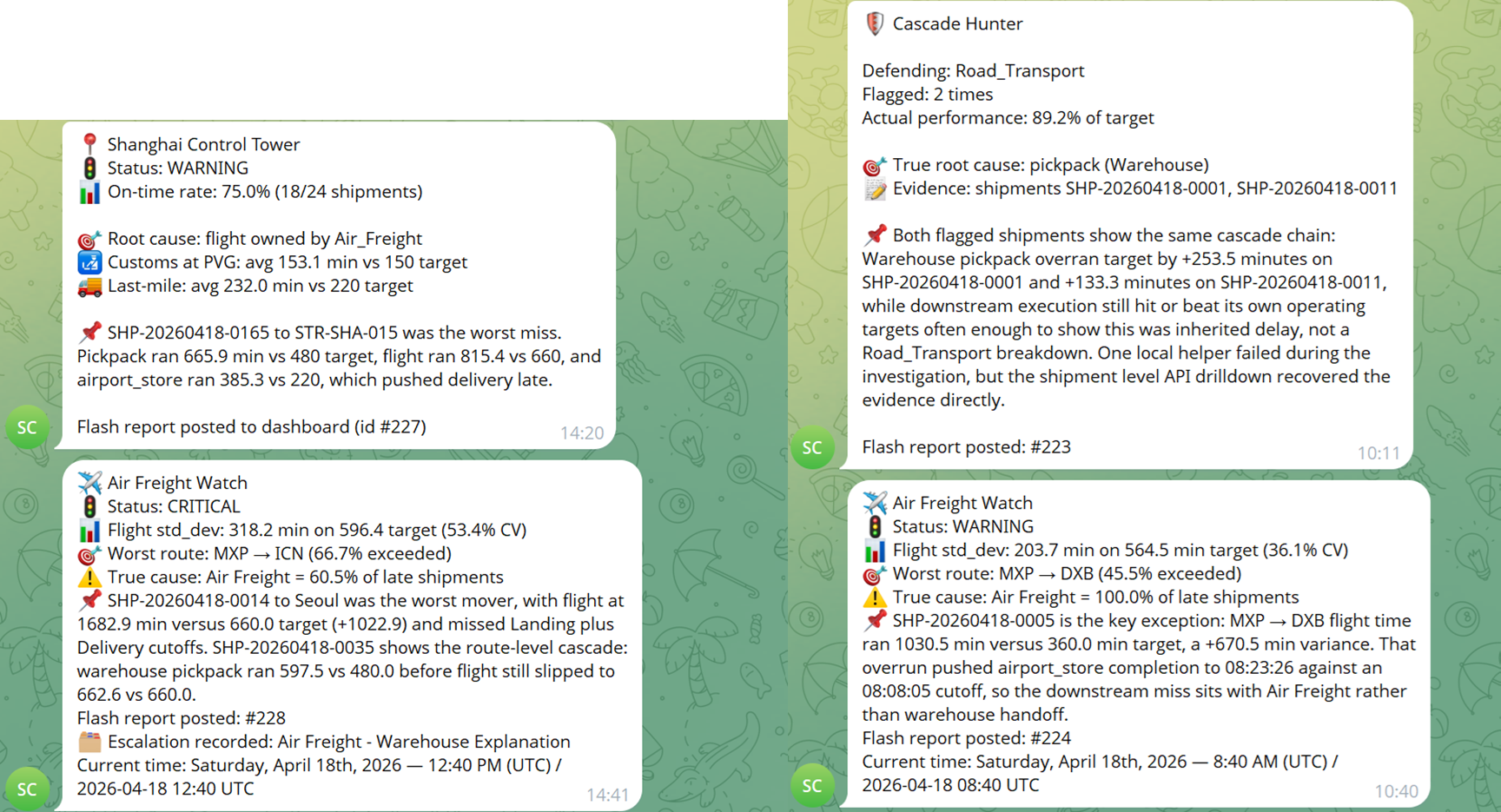 - When something needs attention, the persona posts a flash report to the dashboard and sends a summary to the operational team on Telegram.