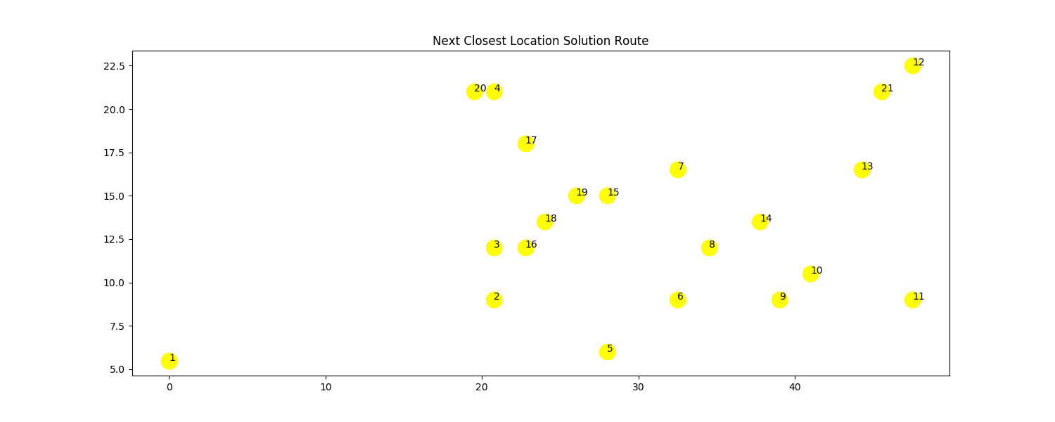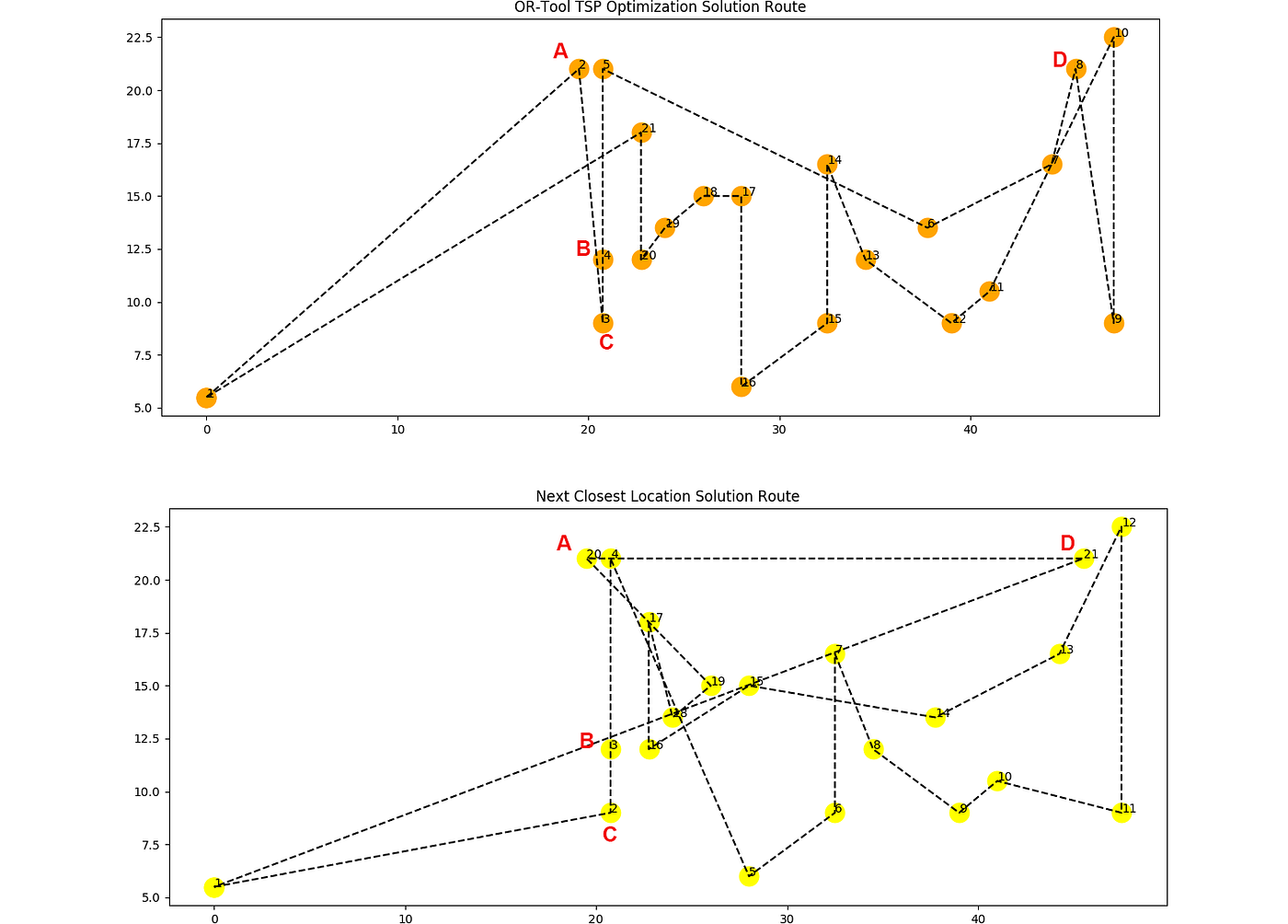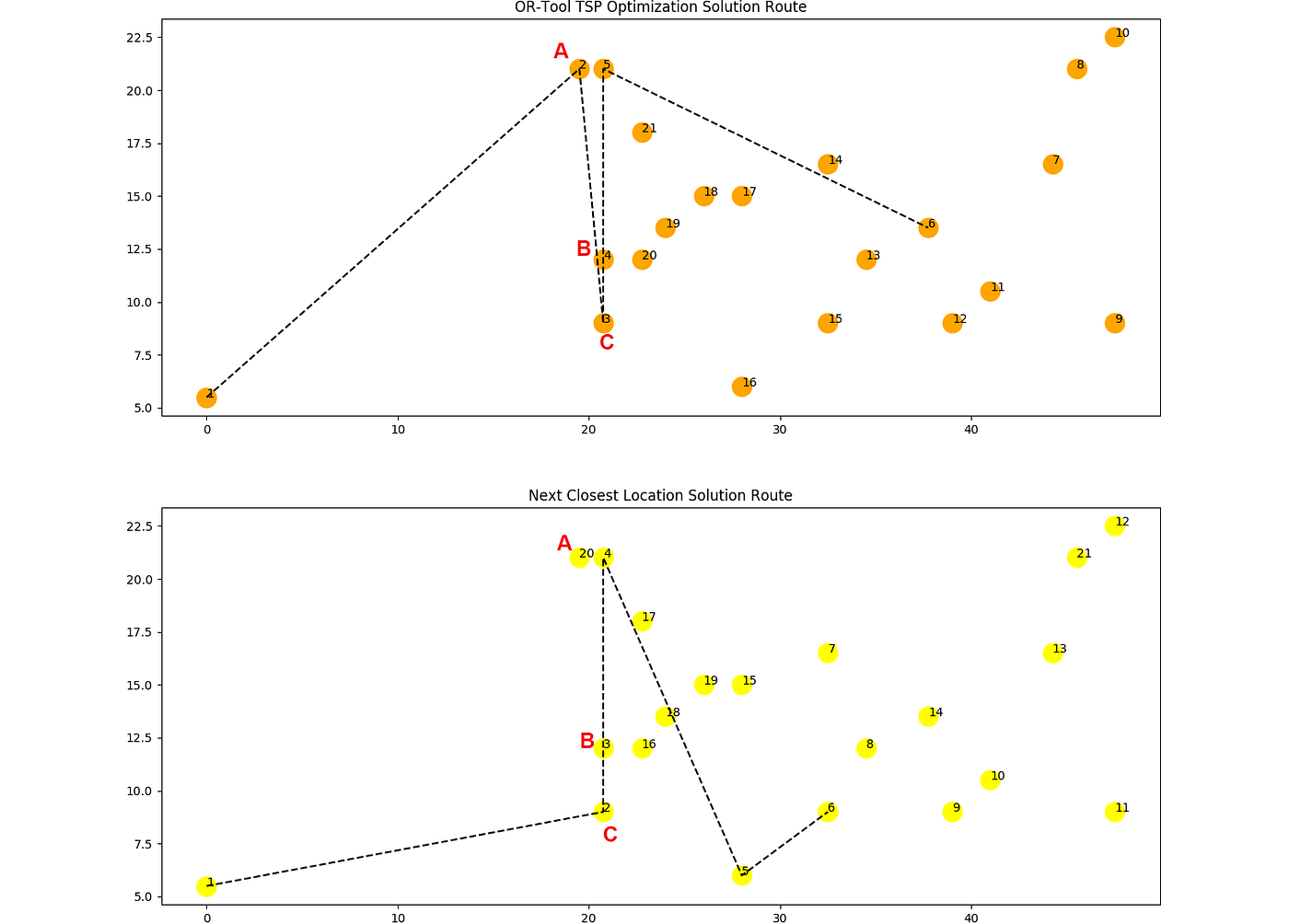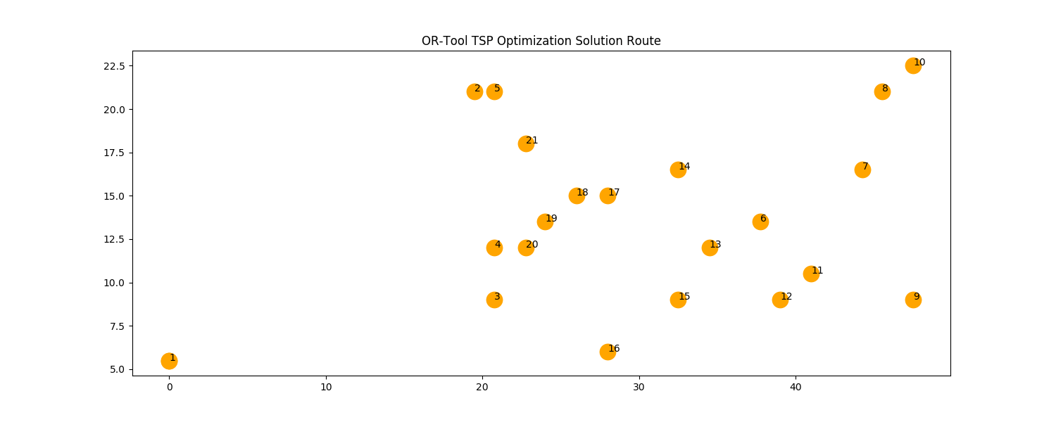 In this specific example, we can see the benefits of the TSP Optimization Solution for the second point (19.5, 21)