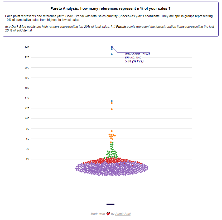 Pareto analysis of sales by item using violin plot and color mapping