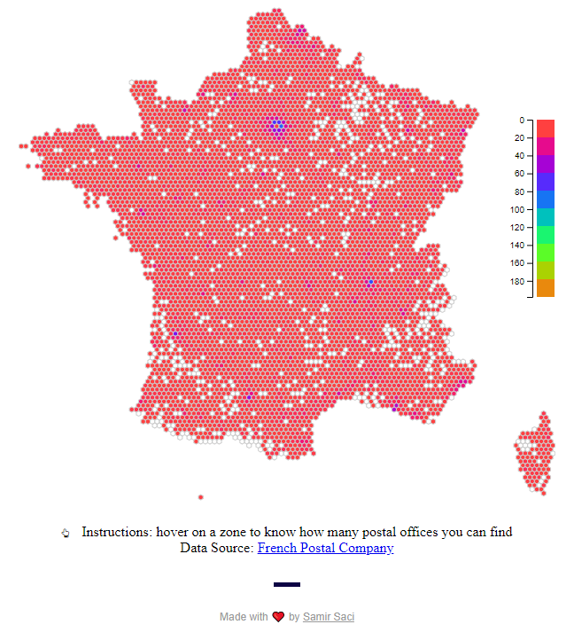 France map divided in hexagons to measure the density of Post Offices per zone