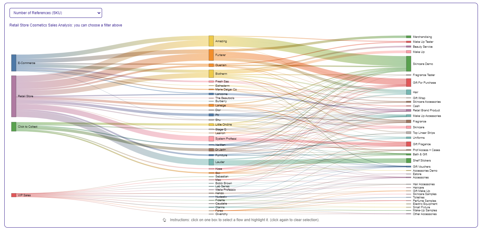 Analyze cosmetics sales using a responsive Sankey Chart by sales channel, brand or category