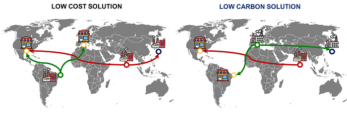 On the right, we propose to use the same model with an adapted objective function that minimises total carbon emissions.