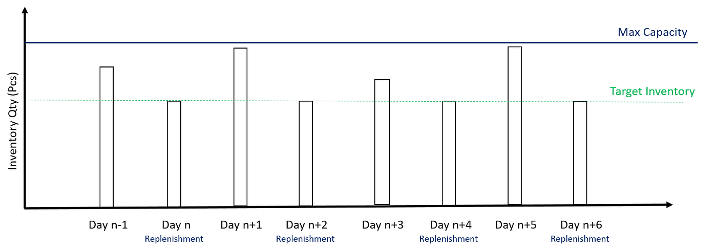 The example above shows an example of replenishment day skipped; day n inventory is higher than minimum inventory and enough to meet day n+1 demand.