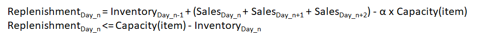 Day_n replenishment needs to cover the demand of Day_n, Day_n+1 and Day_n+2 to reach the inventory level target at the end of Day_n+2 before the next delivery. - Constraint