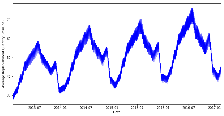 The average replenishment quantity graph is also showing us that sales transaction trends are periodic and follow a trend.