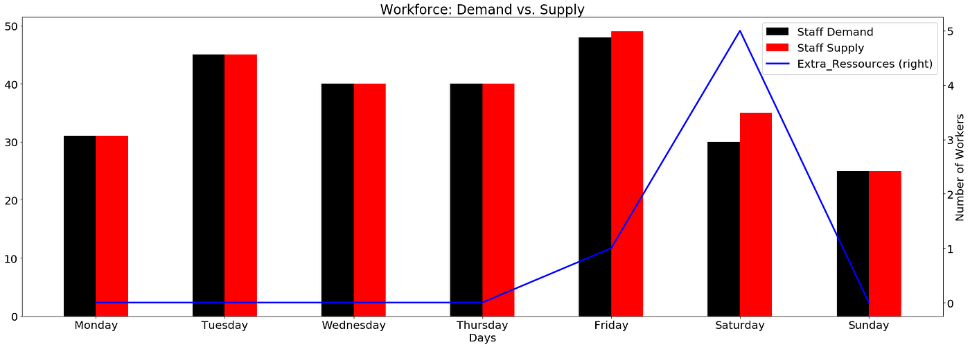 - Add constraints: sum of workers on duty (not on a day off) is higher than the minimum staff demand