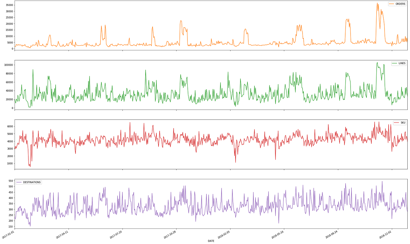 In the example below, you can see the daily variation of key indicators that will drive your workload (#Orders, #Lines, #SKU, …).
